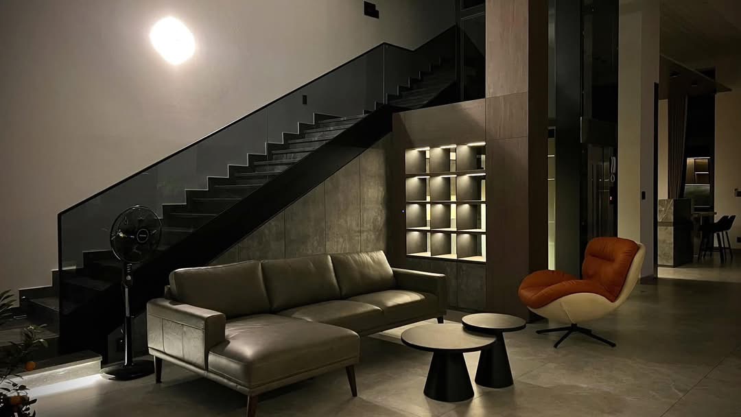 Trong không gian nhà ở mang phong cách hiện đại, chiếc thang máy kính tông đen huyền bí trở thành điểm nhấn nổi bật, vừa đảm bảo công năng di chuyển tiện nghi, vừa đóng vai trò như một “tác phẩm kiến trúc” xuyên suốt các tầng.