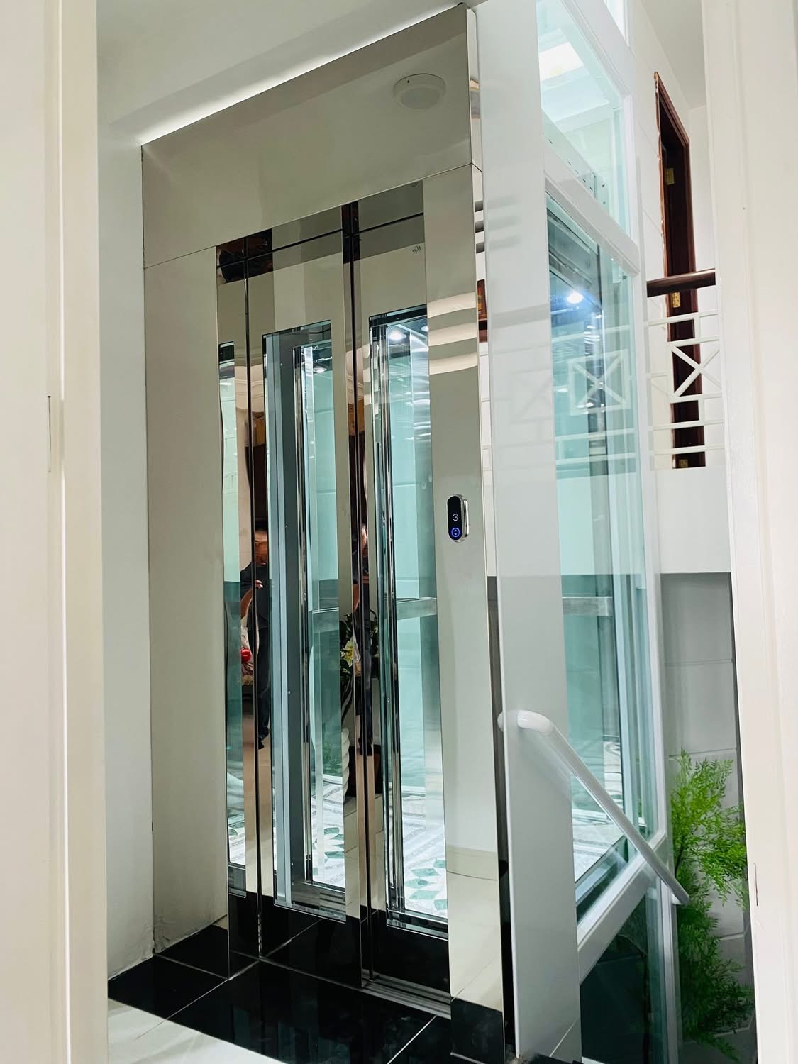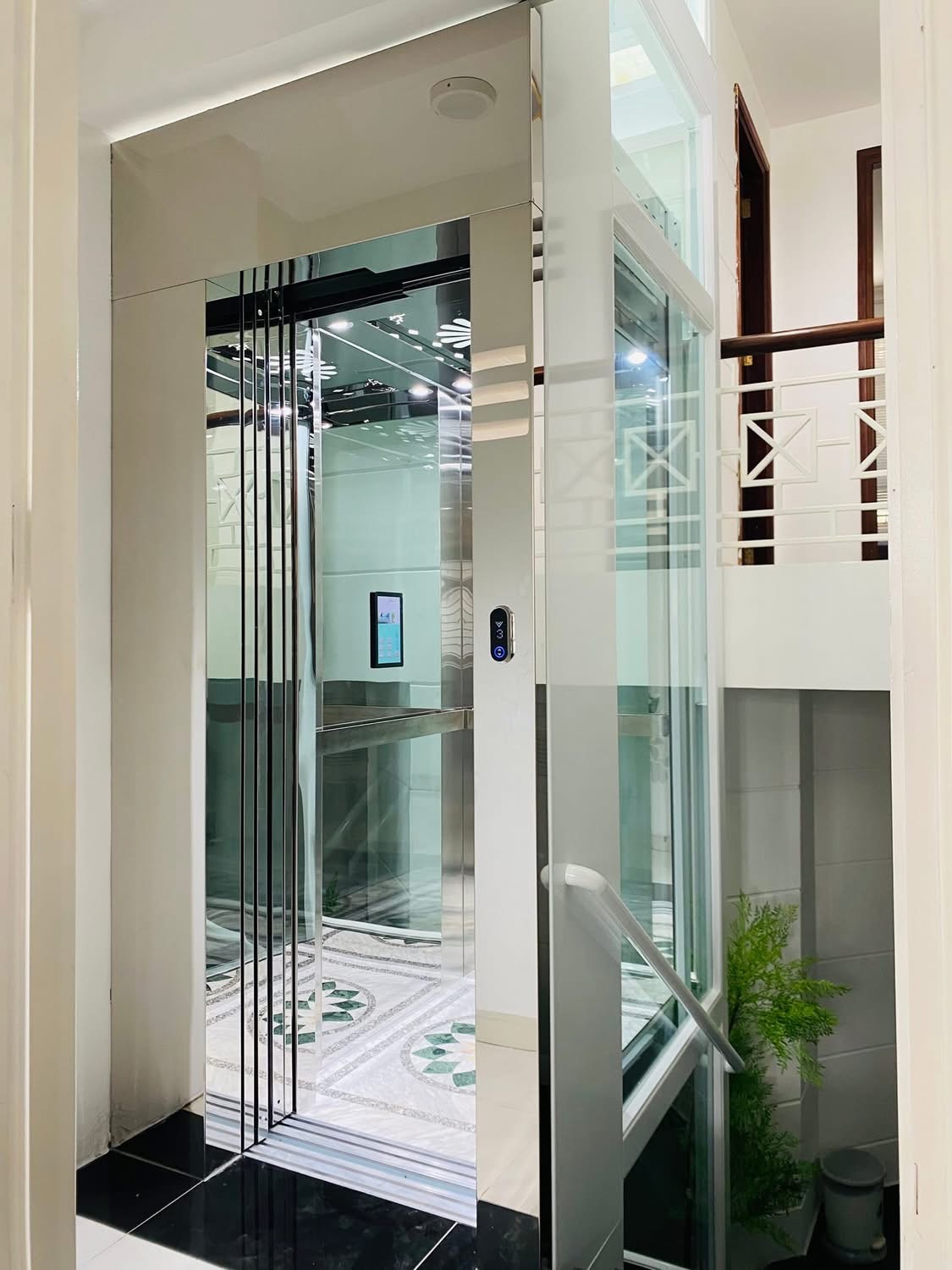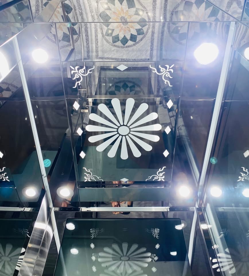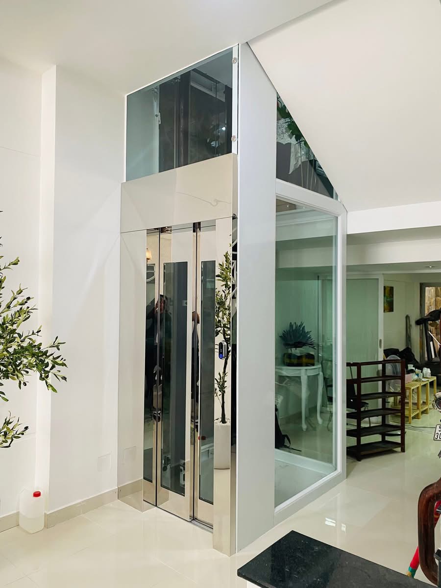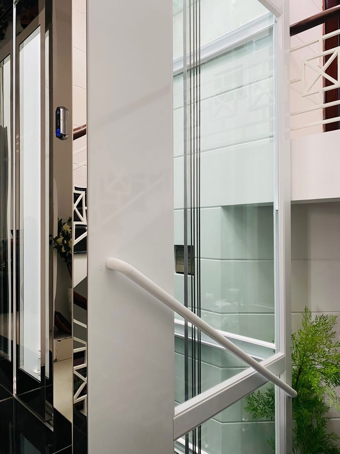 Thang máy khung kính cao cấp, kết hợp cùng inox sáng bóng và hệ thống chiếu sáng tinh tế.