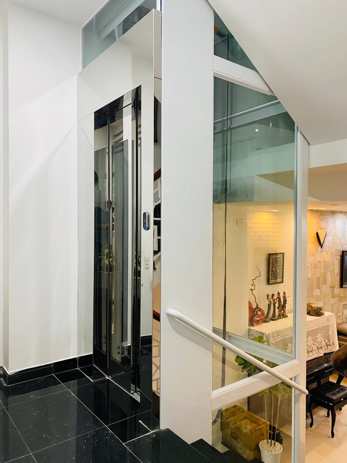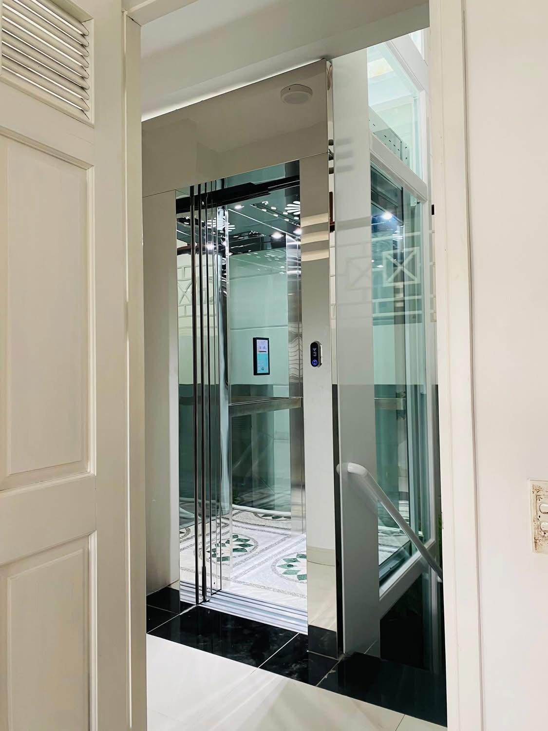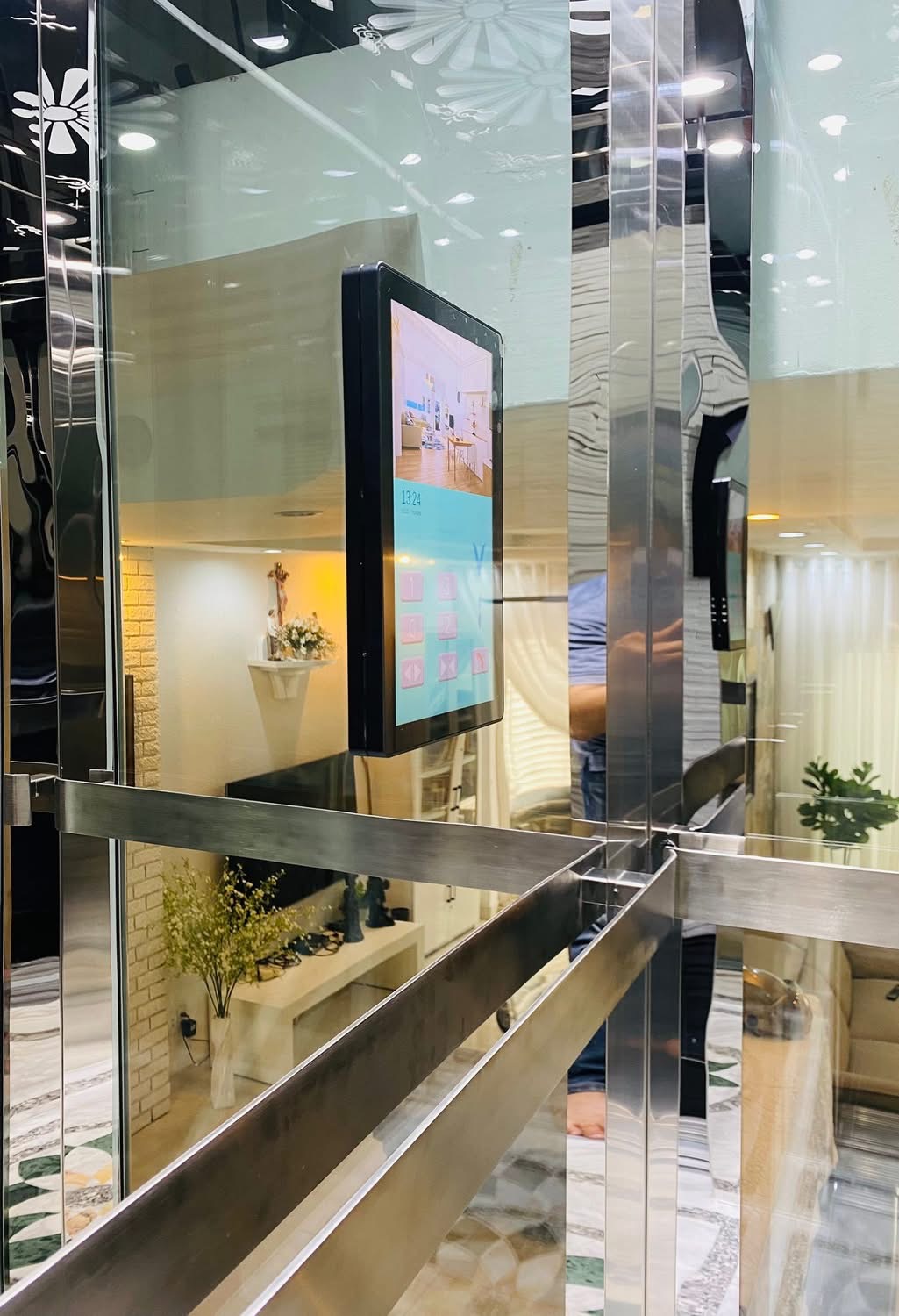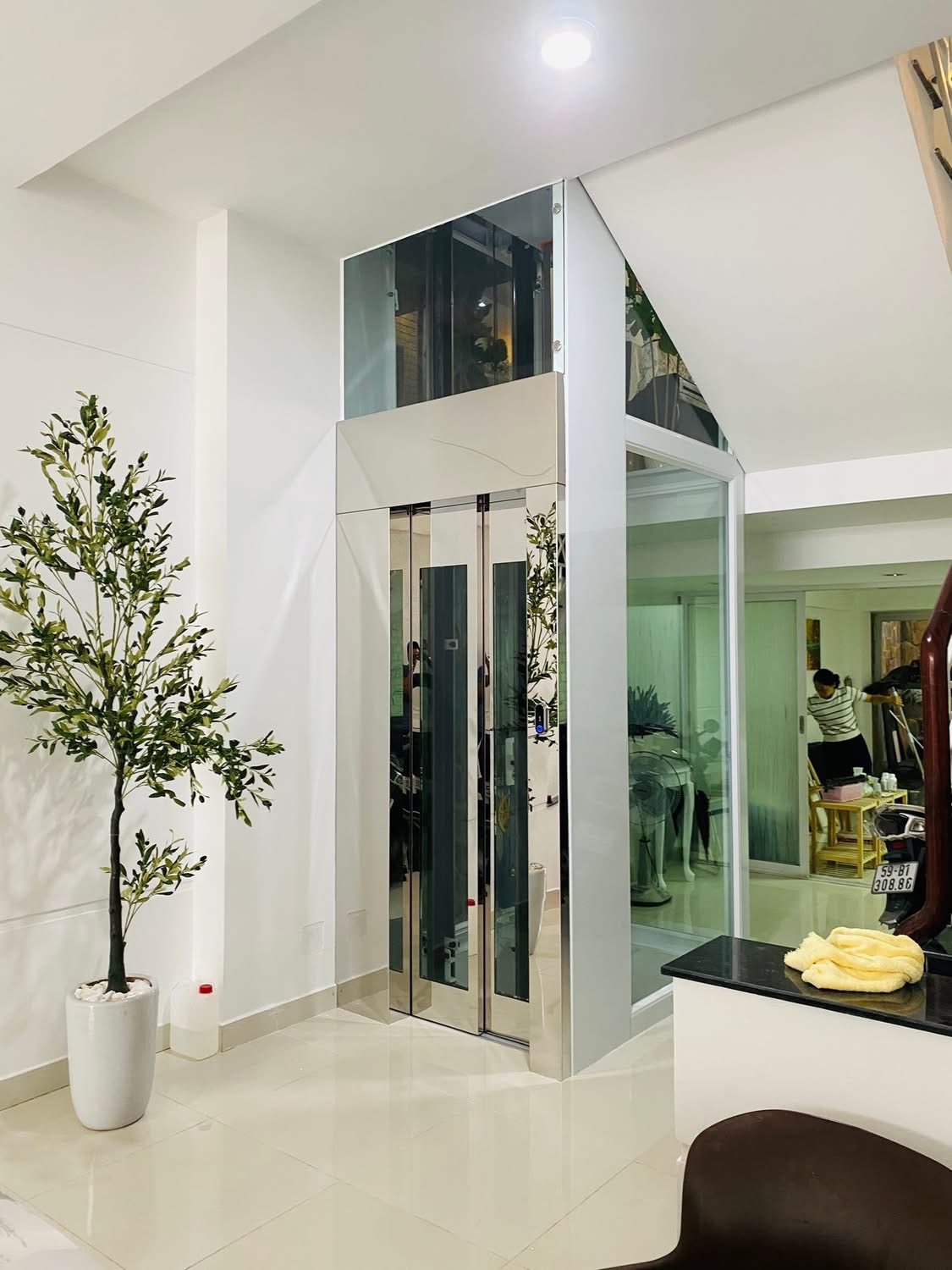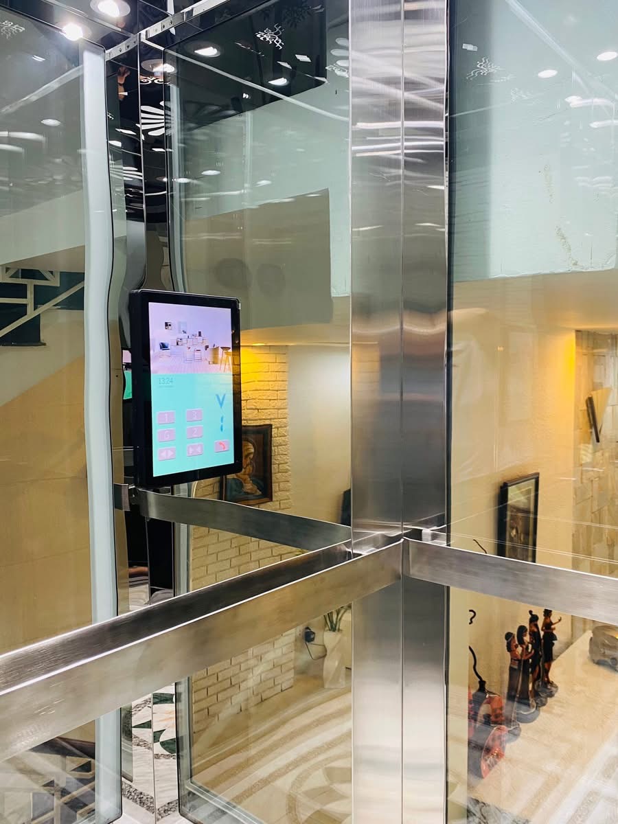 Thang máy khung kính cao cấp, kết hợp cùng inox sáng bóng và hệ thống chiếu sáng tinh tế.