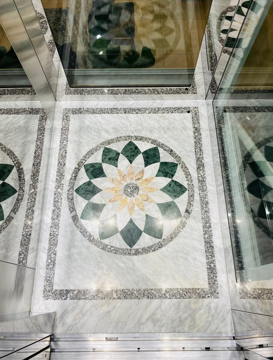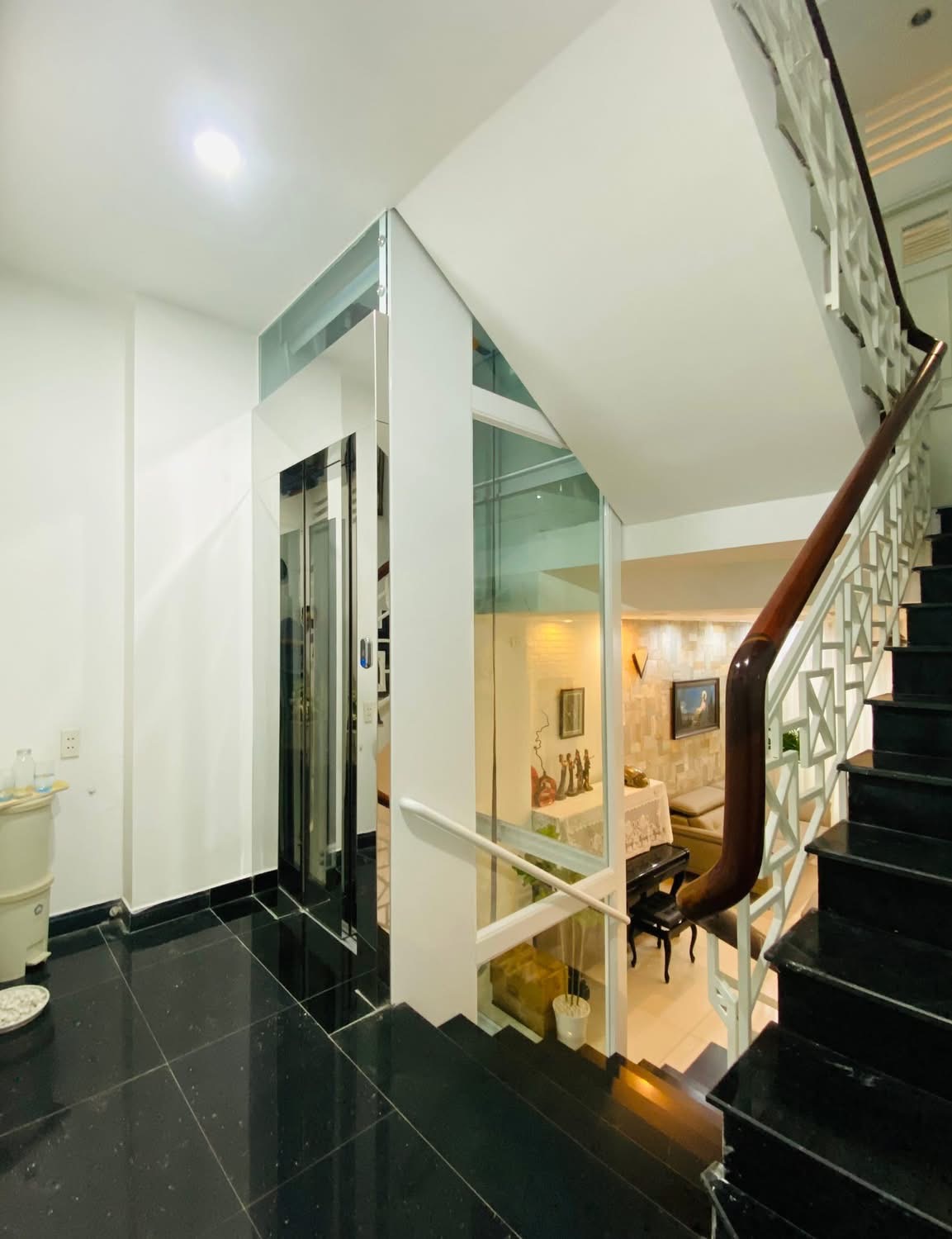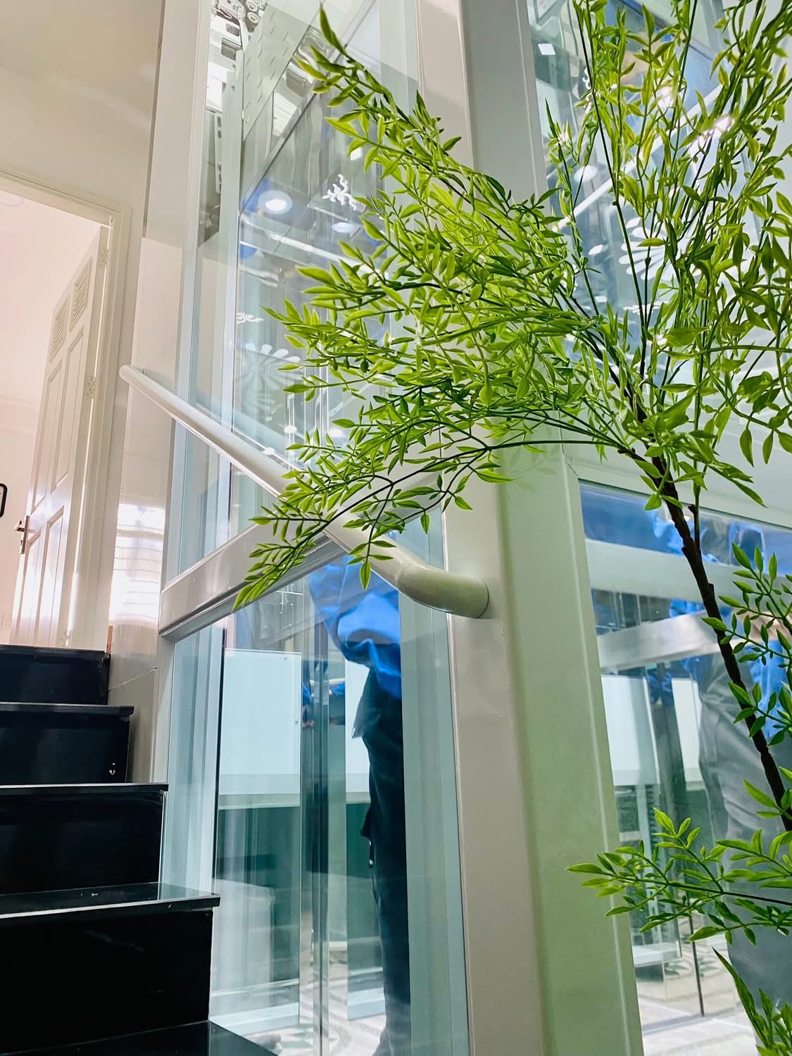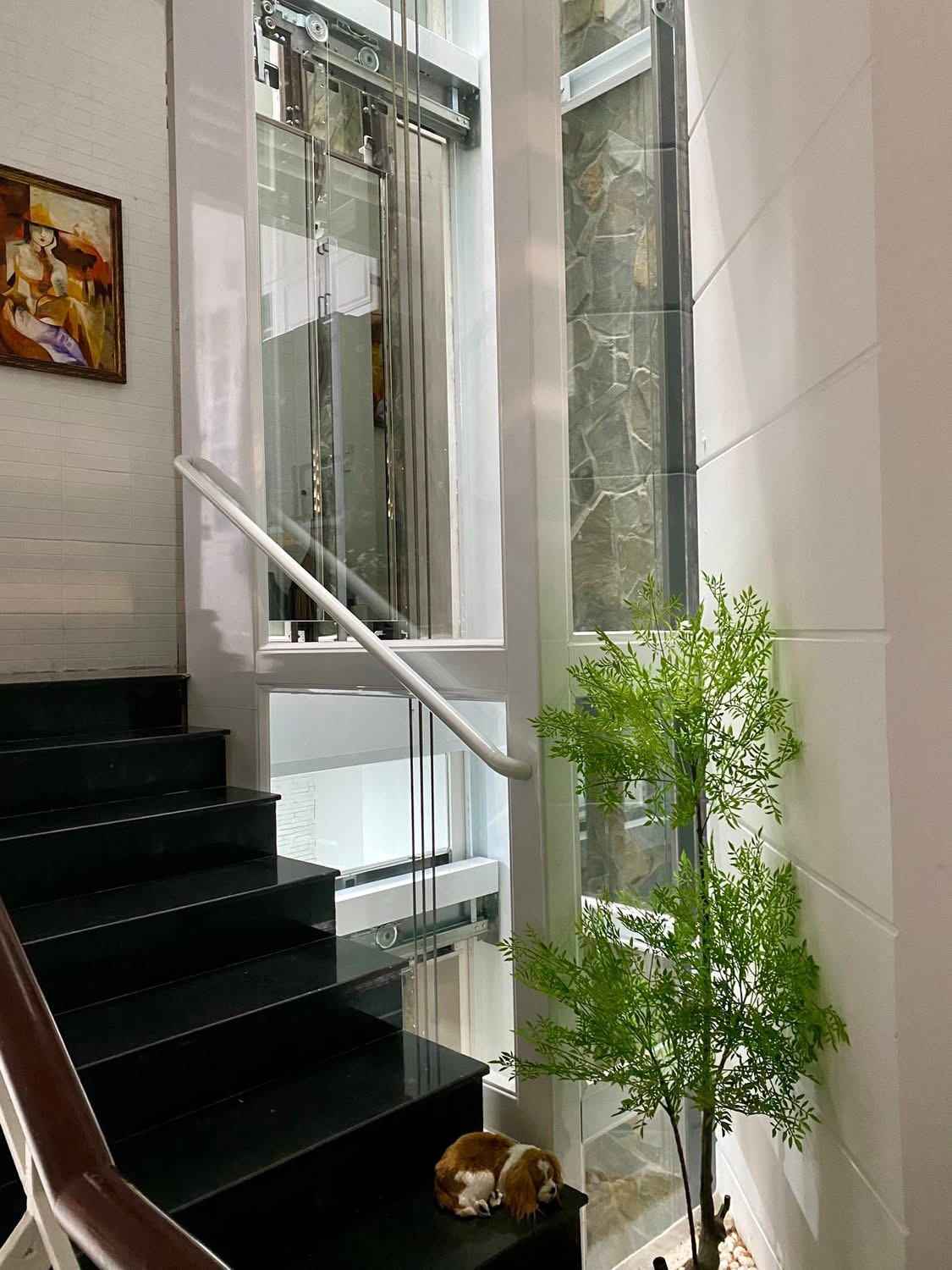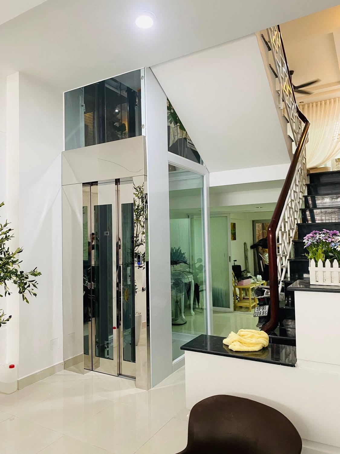 Thang máy khung kính cao cấp, kết hợp cùng inox sáng bóng và hệ thống chiếu sáng tinh tế.