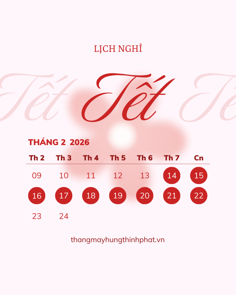 Nhằm tạo điều kiện cho toàn thể cán bộ nhân viên đón Tết Nguyên Đán Bính Ngọ 2026 vui tươi, đầm ấm bên gia đình, đồng thời đảm bảo vận hành sản xuất và chất lượng dịch vụ đến quý khách hàng và đối tác, Công Ty Cổ Phần Kỹ Nghệ Thang Máy Hưng Thịnh […]